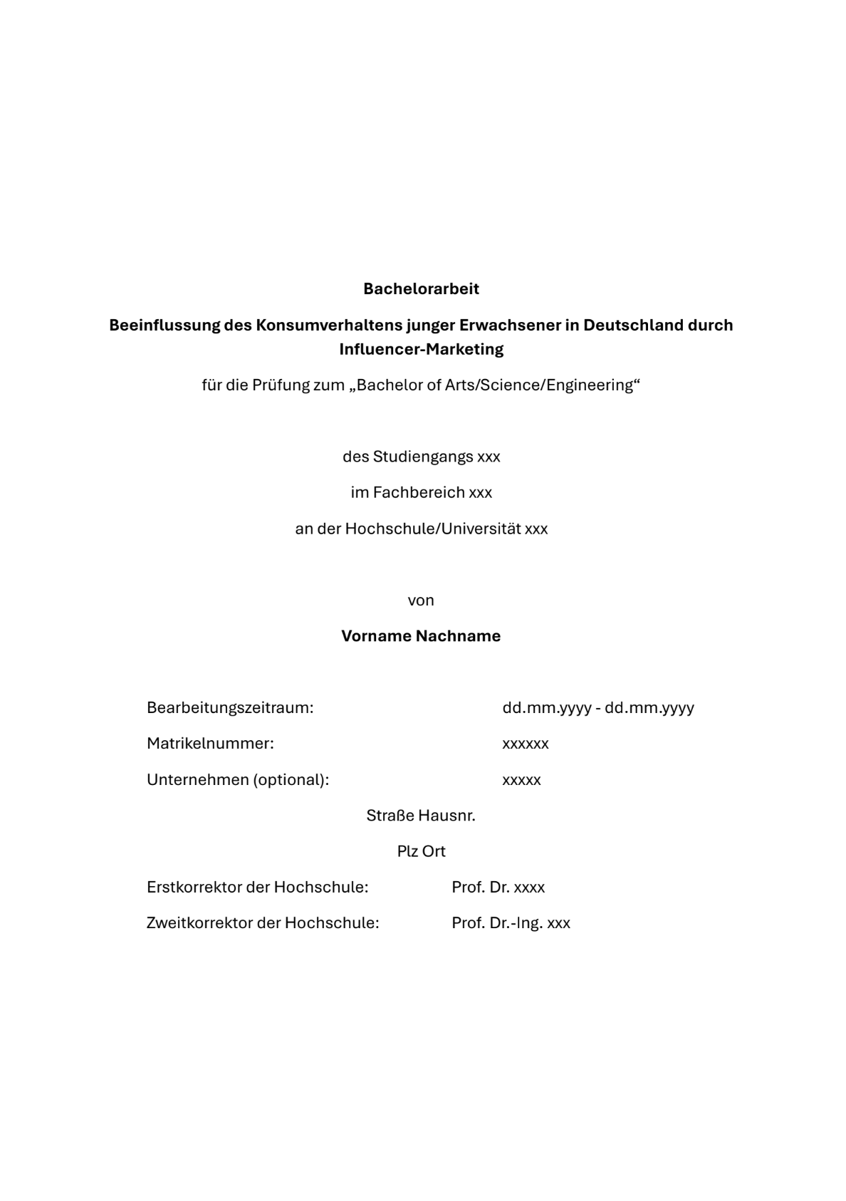 Ein klassischer Aufbau für das Deckblatt an einer Hochschule sieht wie folgt aus: