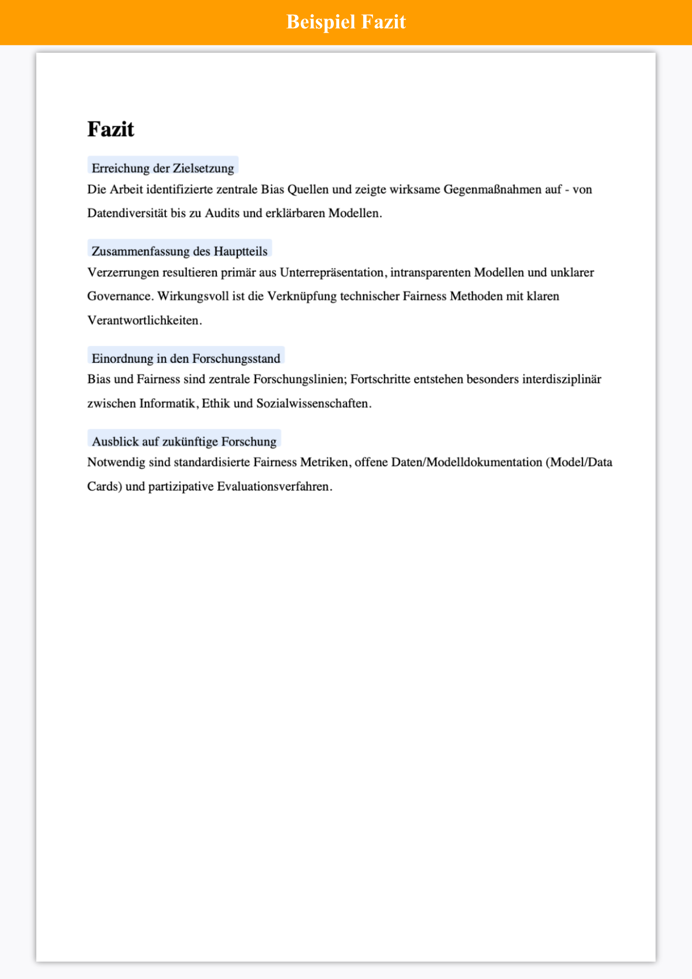 Beispiele sind Lernhilfen. Übernimm keine Passagen 1:1. Prüfe Zitate und Quellenangaben, halte einen einheitlichen Zitierstil ein und dokumentiere eigene Denkleistung. Bei KI-Tools (z. B. ChatGPT) gilt: Transparenz herstellen, Inhalte kritisch prüfen, keine erfundenen Quellen verwenden.