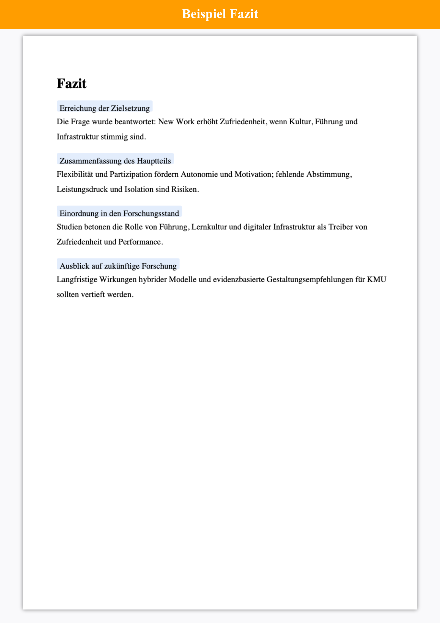 Fazit (Antwort auf Forschungsfrage, Limitationen, Ausblick)